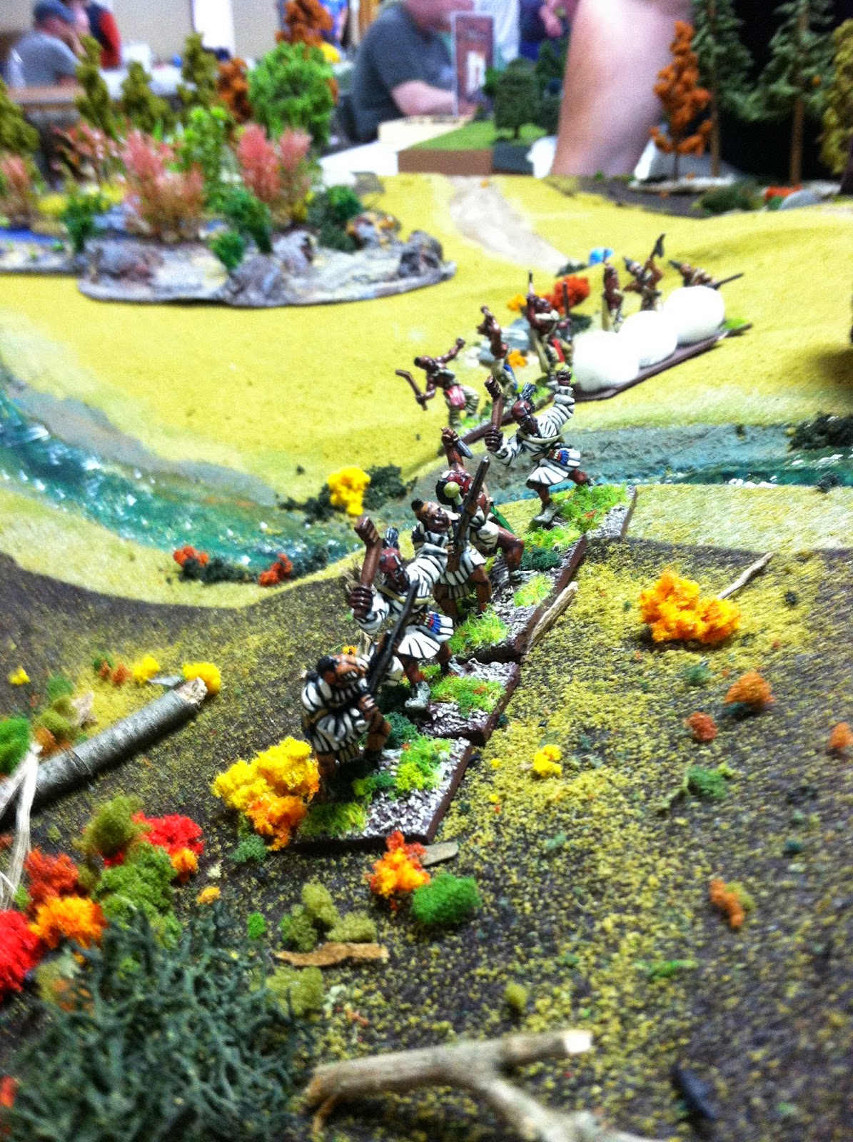 The wrap-up. Footsore Miniatures handed out the spoils with a 4-point Irish warband going to Jeff for first place. Many thanks to Footsore for their generosity and support of these events. It just so happened the US Grand Melee Champion, Jeff Wiltrout, was present at Historicon and he threw down the gauntlet for the victor of the tournament to play in a friendly post tournament game. Jeff W. rolled out his Skraelings, "for the last time" to face off against Jeff Fletcher's Crusaders. I am not sure why but Jeff F. decided to mix up his force and instead of fielding his tournament winning Crusader army he rolled out a "Peter the Hermit" version. So we had Skraelings vs fanatical pilgrims. In the end the Skraelings came out victorious.